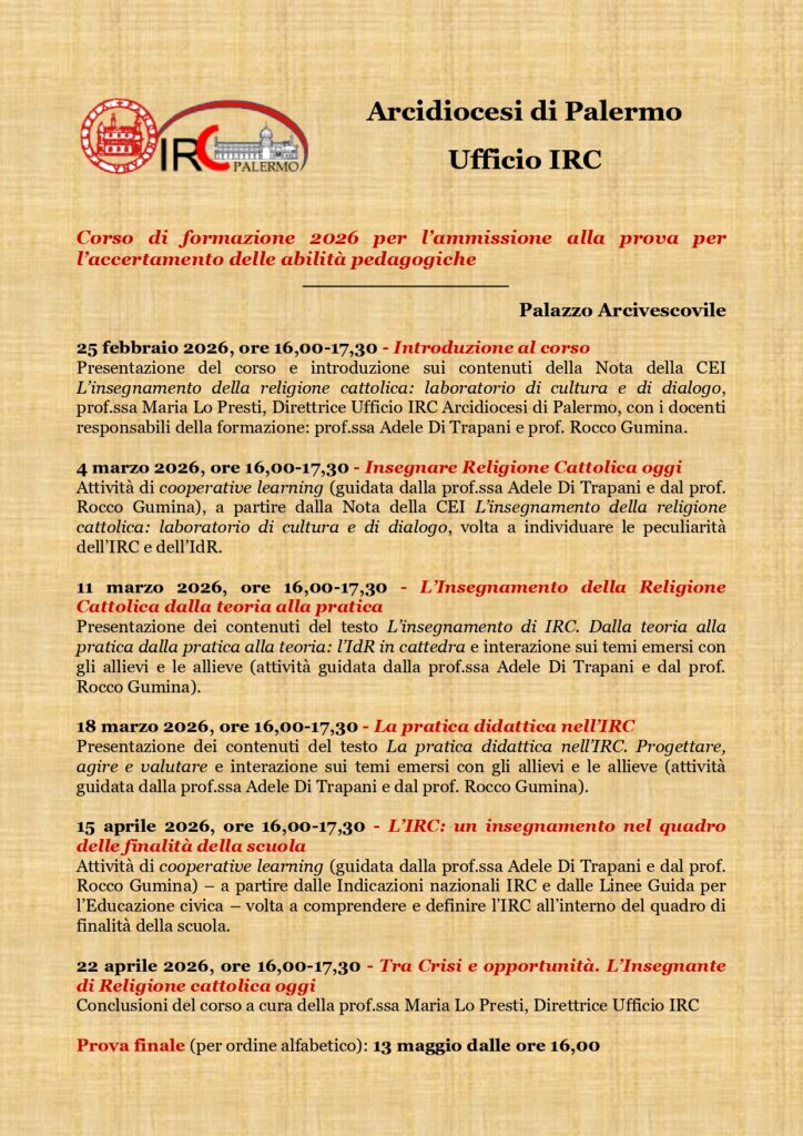 Si comunica che, per gli appartenenti al territorio dell’Arcidiocesi di Palermo in possesso di titolo teologico riconosciuto idoneo all’Insegnamento della Religione Cattolica secondo la normativa vigente, si svolgerà a partire dal prossimo mercoledì 25 febbraio 2026 il percorso volto all’ammissione alla prova per l’accertamento del possesso delle abilità pedagogiche.