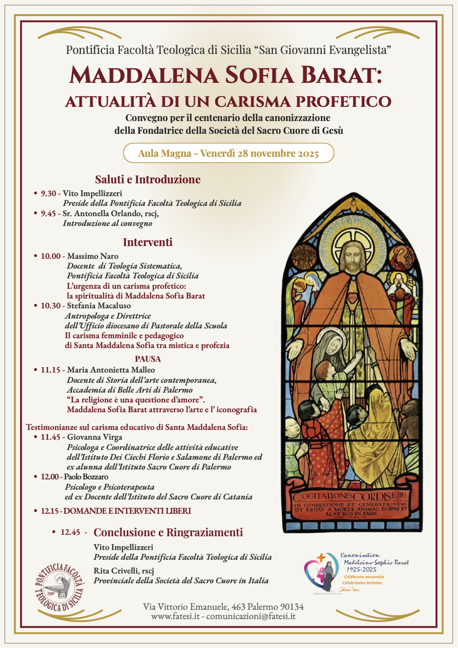 Formazione e cultura Maddalena Sofia Barat: attualità di un carisma profetico Dario Di Fiore webmaster 2 ore ago |-> Locandina Convegno Maddalena Sofia Barat Post Navigation Previous San Francesco d’Assisi: La testimonianza cristiana More Stories Formazione e cultura San Francesco d’Assisi: La testimonianza cristiana Dario Di Fiore webmaster 2 ore ago Formazione e cultura Convegno di Patristica – La speranza della Chiesa nella società imperiale antica (I-VI secc.) Dario Di Fiore webmaster 6 giorni ago Formazione e cultura In primo piano Nicea: espressione ecclesiale dell’evento Cristo Dario Di Fiore webmaster 4 settimane ago